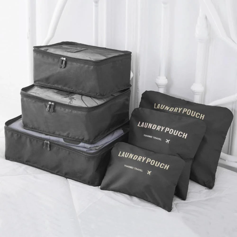 - Set of 6 suitcase travel organizers: A complete system that covers clothing, underwear, accessories, and toiletries in mixed sizes.